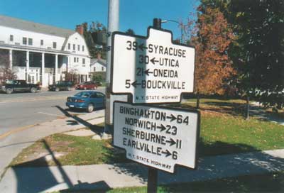 This directional guides traffic through a tricky intersection in downtown Hamilton, NY, where NY 12B makes a jog to the left to continue north to Utica.