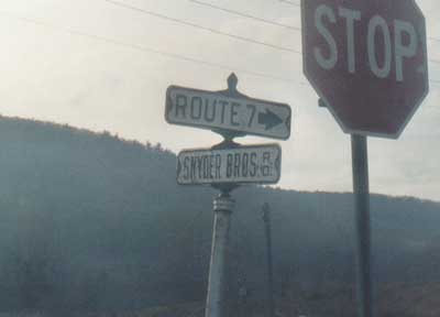 New York's use of street signs as directionals is not limited to town destinations. This assembly on NY 145 between Middleburgh and Cobleskill, directs traffic to NY 7, 1 mile away. Snyder Brothers Rd. originally connected to NY 7 itself, but was cut off by I-88. This sign was replaced when the town of Cobleskill upgraded its road signs.
