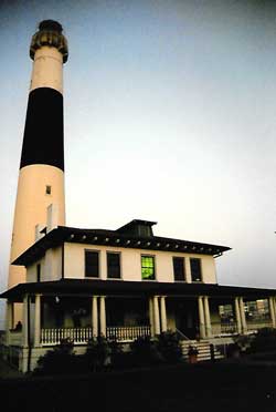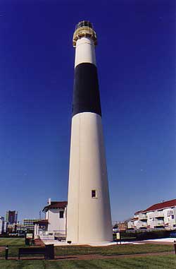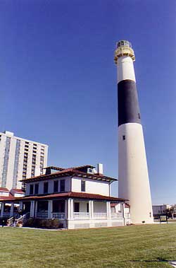 Constructed in 1855-1856, like Barnegat under the direction of Lieut. George G. Meade, Absecon (Ab-SEE-kun) Lighthouse stands at the northern end of Absecon Island (Atlantic City) and threw its light out over the Atlantic Ocean until 1933. The tallest lighthouse in New Jersey (although there is a longstanding dispute of the matter with Barnegat), Absecon is the third tallest in country. Due to the filling in of land north and east of the lighthouse, it now stands several blocks from the shore and is dwarfed by the gambling palaces that begin a short distance away. The middle and right photos show the rebuilt lightkeeper's house; the original had been under restoration when destroyed by fire in 1998. The photo on the right is from the 2012 Challenge, when I made a night climb.