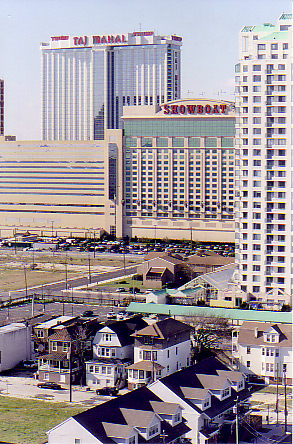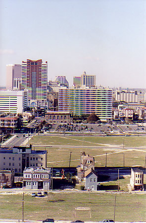 From the top of the lighthouse, one can see the contrasts in Atlantic City, glitzy casinos on the left and empty lots and desolation where houses of the Inlet neighborhood once stood on the right. The city has been attempting to rehabilitate the area with new housing and attractions.