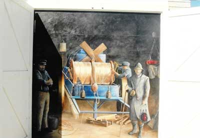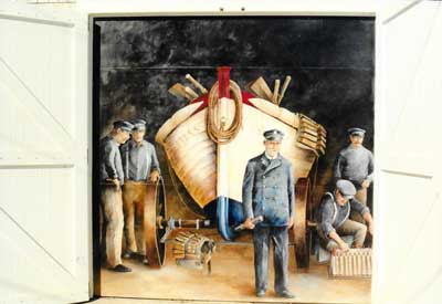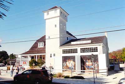 The Stone Harbor Life Saving Station building now houses the local American Legion Hall. The paintings, which can be seen on the front of the building on the right show the rescuers ready to move the breeches buoy and rescue boat into position to rescue shipwreck victims.