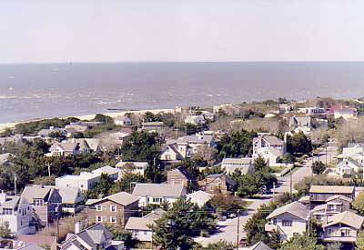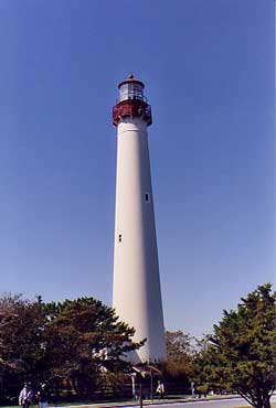 Along with the light at Cape Henlopen in Delaware, Cape May Lighthouse has marked the entrance to Delaware Bay since 1859. Located at the southern tip of New Jersey, the lighthouse is surrounded by Cape May Point State Park, which includes the beaches in the photo on the right; the city of Cape May is in the distance. The houses of the borough of Cape May Point are seen in the middle photo.