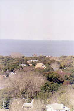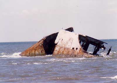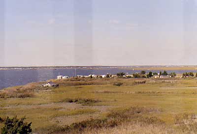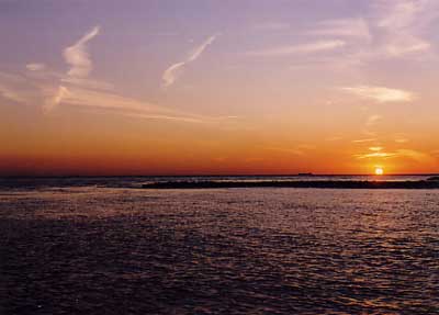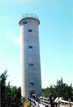 Beyond Cape May Point to the north is Sunset Beach (left photo). What appears to be a rock in the water near shore (above and just to the left of the house with the tan roof) is actually the remains of a concrete ship, moored there to serve as a pier in an abortive 1920s attempt to establish a ferry to Delaware. A closeup of the ship can be seen in the middle photo. During World War I, several concrete ships were commissioned in an effort to save production of steel for armaments. Although the ships proved feasible, they were never used because of inefficient speed and were sold off after the war. Now part of the state park is Fire Control Tower 23, one of several still-visible remnants of World War II fortifications. This tower and several others on the cape were constructed to provide target guidance for anti-aircraft guns based in Delaware in case of an air or sea attack by Axis forces. In a 1988 photograph, the sun sets over Delaware Bay.