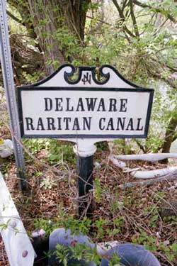 When NJ 27 was realigned to eliminate a late 18th-century bridge at Kingston, NJ, that had become too dangerous for modern traffic, the bridge and this sign were preserved in a small part of the Delaware and Raritan Canal State Park.