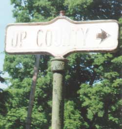 Tuscan Rd. is an old alignment of NY 7 in the town of Worcester. Up County Rd. branches off the loop. I have not been able to determine why "Rd." was left off the sign. It does not seem to be a route that would be taken to the northern part of Otsego County. These signs were both replaced when Worcester upgraded its road signs.